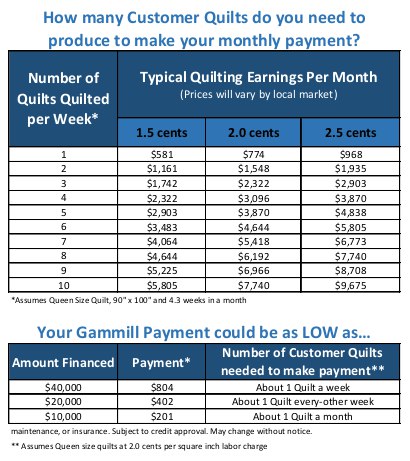 Here’s a chart that can help you figure it out.  Keep in mind that the maximum number of quilts that a Statler by Gammill with one operator can reasonably handle is 12-16 per week, if you plan to go beyond that you’ll need either an employee or a second machine: